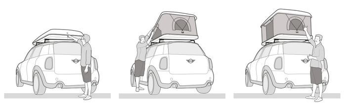 Всички собственици на Mini да ликуват! Те вече могат да опънат палатка на покрива на своя Countryman. Италианският производител на подобни палатки на име Autohome е разработил палатка за най-голямото Mini. Тя е с размери 130 х 210 см и изглежда като компактен пакет с височина едва 33 см когато е сгъната. Разпъната осигурява прилично място за спане на двама души, с височина от 94 сантиметра.